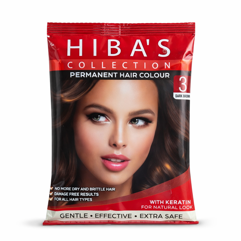 Hiba’s Collection Hair Color 3N Dark Brown delivers a deep, rich dark brown shade with natural-looking shine. Its keratin-enriched formula helps protect hair while coloring, leaving it smooth and soft. Designed for even coverage, it effectively conceals greys and enhances overall hair tone. Perfect for achieving salon-style results at home in a convenient 20ml sachet.